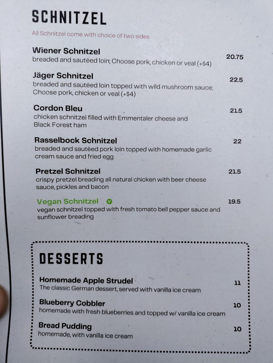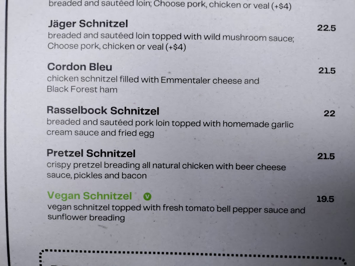 Crispy breaded 'beyond' schnitzel. Topped w/ either red bell pepper & tomato sauce (vegan) or wild mushroom sauce (vegetarian)